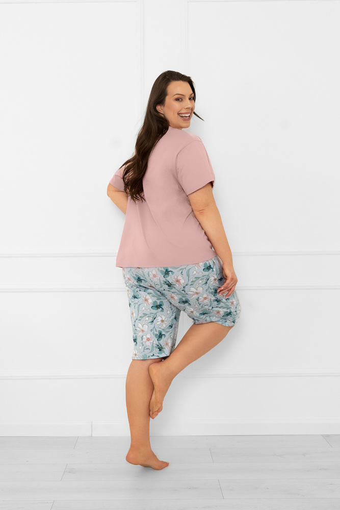I pigiami da donna Perlis sono una combinazione di comfort e stile morbido e femminile. Il set è composto da una T-shirt liscia a maniche corte con scollo rotondo e da un pantalone a 1/2 lunghezza con elastico in vita. I pantaloni sono decorati con un sottile motivo floreale in colori pastello, che aumenta il fascino del modello. Realizzato in cotone naturale, questo pigiama è traspirante e piacevole al tatto, perfetto per l'estate. Funziona sia per dormire che per rilassarsi a casa.