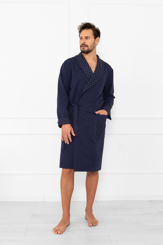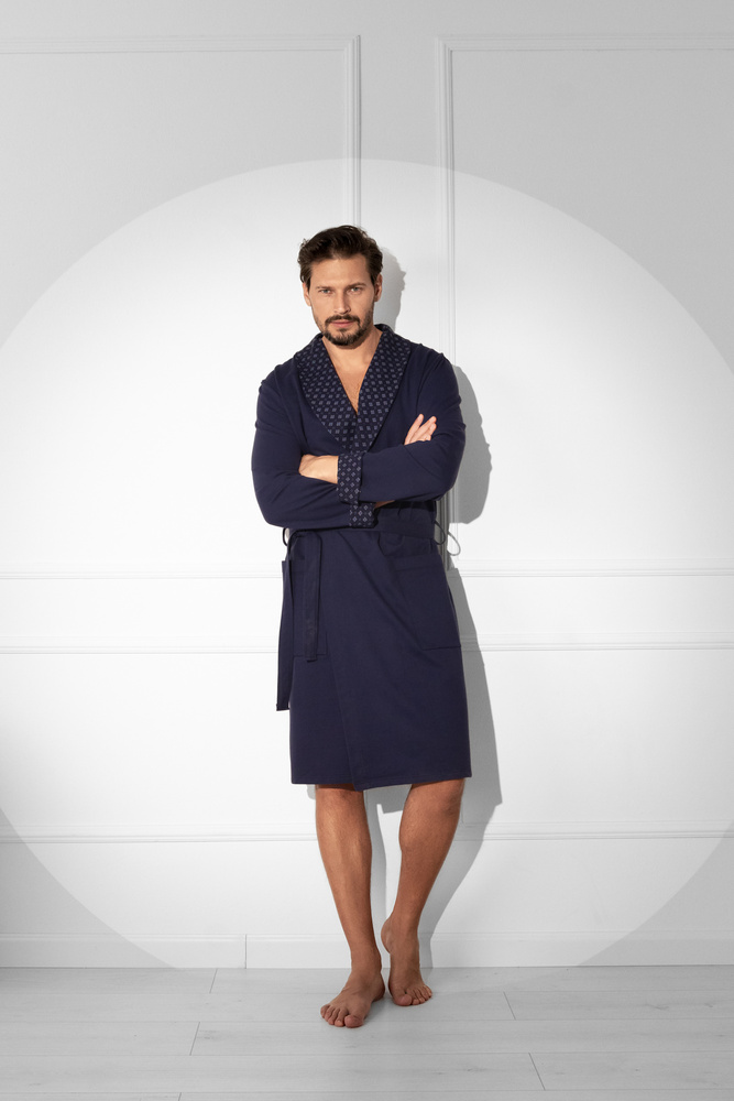 Elegante accappatoio Gerard da uomo in 100% cotone di alta qualità. Taglio classico, collo a scialle, polsini con elegante stampa, pratiche tasche e laccetto in vita per una perfetta vestibilità.