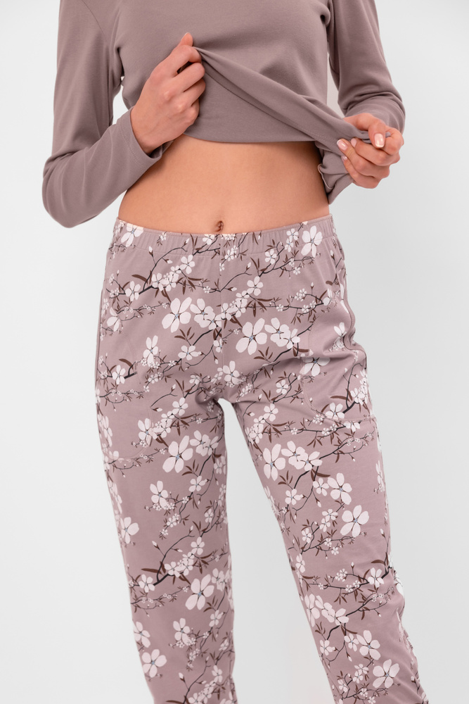 I pigiami da donna Kimuri sono la combinazione perfetta di comfort e stile. Realizzato in cotone naturale, è morbido, traspirante e delicato sulla pelle. Il top del set è una blusa liscia a maniche lunghe in una calda tonalità cappuccino, decorata con un sottile fiocco di raso sulla scollatura rotonda.