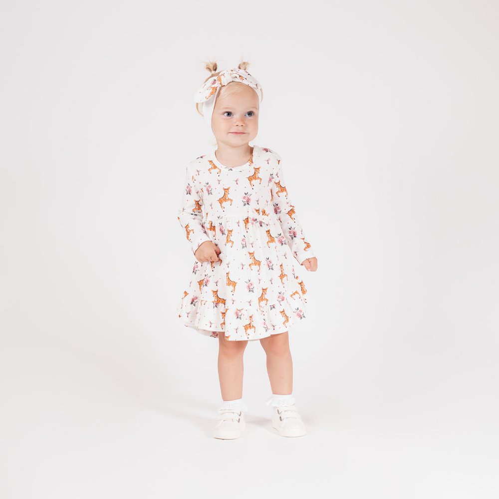 Il modello ha manica lunga e un taglio svasato rifinito con un volant, che gli conferisce un fascino femminile. Un fiocco decorativo è posto in vita e il tutto è completato da una simpatica stampa di cervi e fiori.