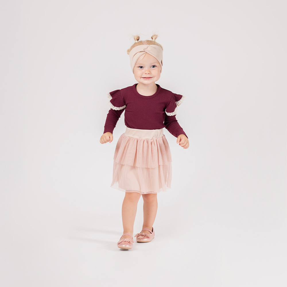 Il modello si distingue per le balze decorative sulle spalle, rifinite con un delicato pizzo, che conferiscono all'insieme un fascino unico. La manica lunga rende la blusa perfetta per le giornate più fresche e la pratica chiusura a bottoni sul retro la rende facile da indossare.