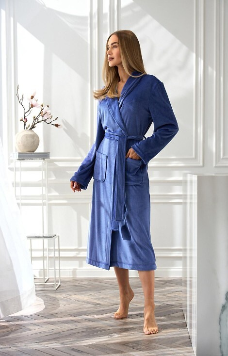 Questo taglio classico e lungo, con cintura e pratiche tasche, è perfetto come vestaglia da casa o come regalo per una persona cara. Grazie alle finiture eleganti, alla trama sottile dei tessuti e alle cuciture accurate, il modello AURA combina funzionalità ed eleganza.