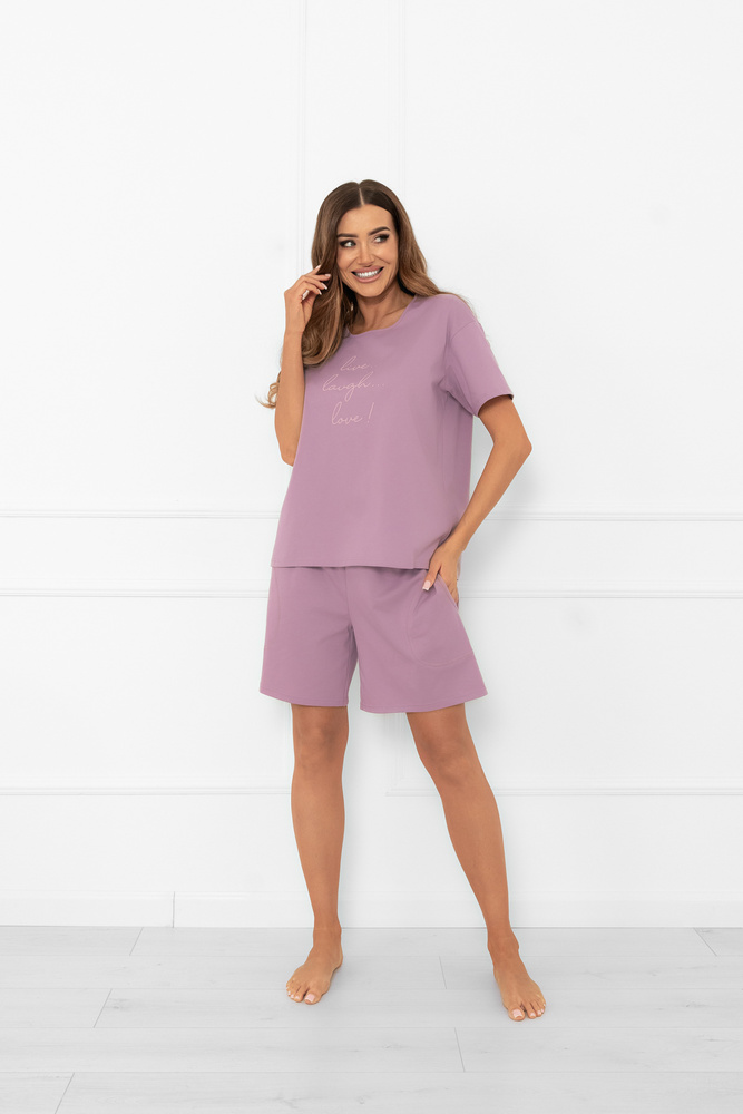 La T-shirt a maniche corte ha un classico scollo rotondo e una sottile stampa sul petto che aggiunge leggerezza e un tocco femminile. I pantaloncini corti con pratiche tasche laterali garantiscono libertà di movimento e comfort sia durante la notte che nei momenti di relax a casa.
