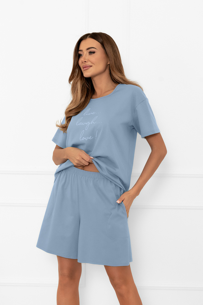 La T-shirt a maniche corte ha un classico scollo rotondo e una sottile stampa sul petto che aggiunge leggerezza e un tocco femminile. I pantaloncini corti con pratiche tasche laterali garantiscono libertà di movimento e comfort sia durante la notte che nei momenti di relax a casa.