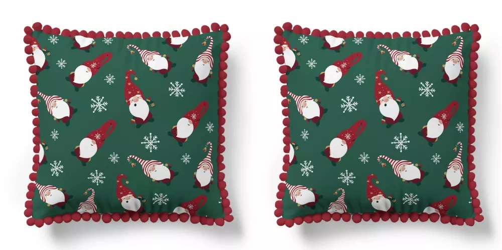 5383 Una federa decorativa natalizia Christmas Deco Detexpol con gnomi e fiocchi di neve su sfondo verde - zip