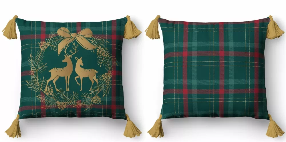5380 Una federa decorativa natalizia Detexpol con renna e ghirlanda su sfondo a quadri - zip