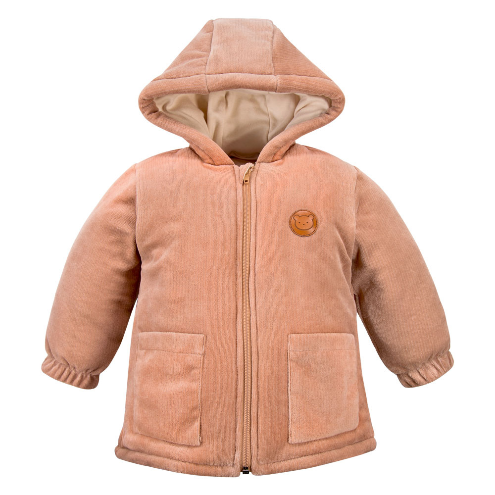Il modello è dotato di un pratico cappuccio che protegge dal vento e dal gelo, di due tasche frontali e di una cerniera per indossarlo facilmente. Decorato con una sottile toppa a forma di orsetto, unisce la funzionalità a un adorabile stile infantile.