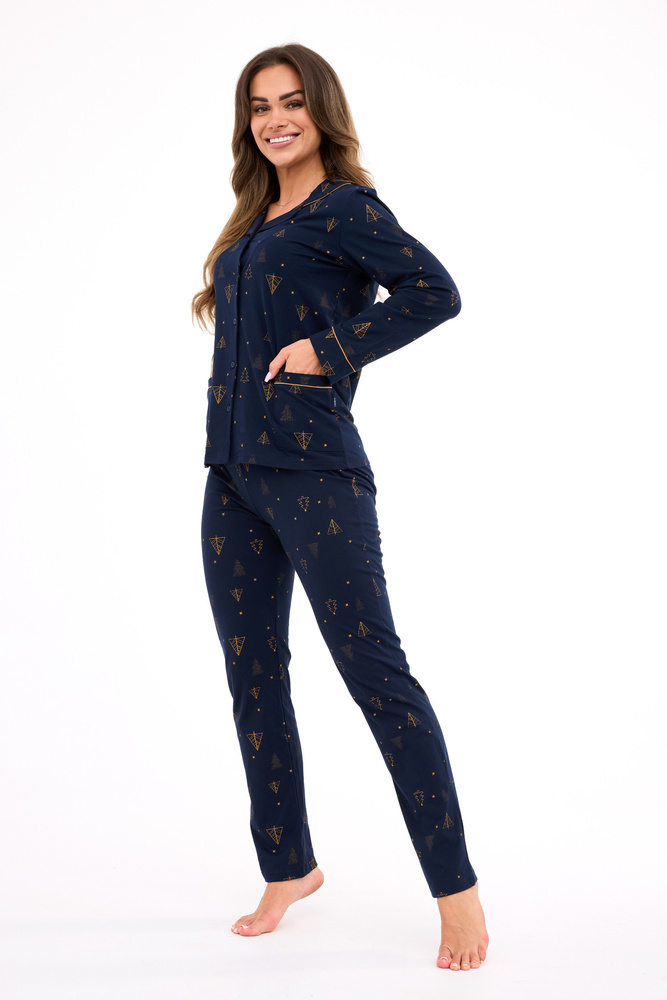 Oro di Cornette è un pigiama da donna lussuoso ed elegante, pensato per le donne che amano sentirsi speciali, anche la mattina di Natale. Il colore blu navy, completato da sottili accenti dorati, crea un look invernale di grande stile.