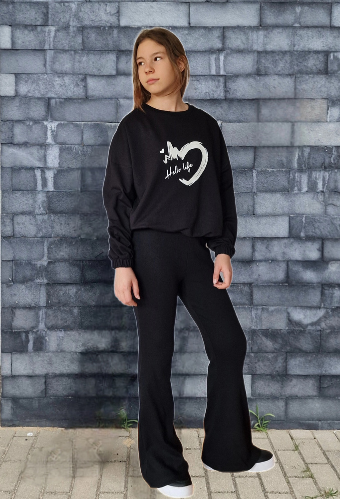 - Pantaloni a campana da bambina in maglia a coste nera. Morbido cotone con elastan, confortevole ed elasticizzato.