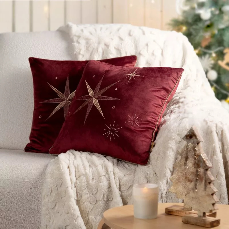 • Elegante federa natalizia Eurofirany CHP 259 in bordeaux con ricamo di stelle champagne. Il soffice velluto con una morbida lucentezza crea un'atmosfera speciale e aggiunge un fascino festoso agli interni.