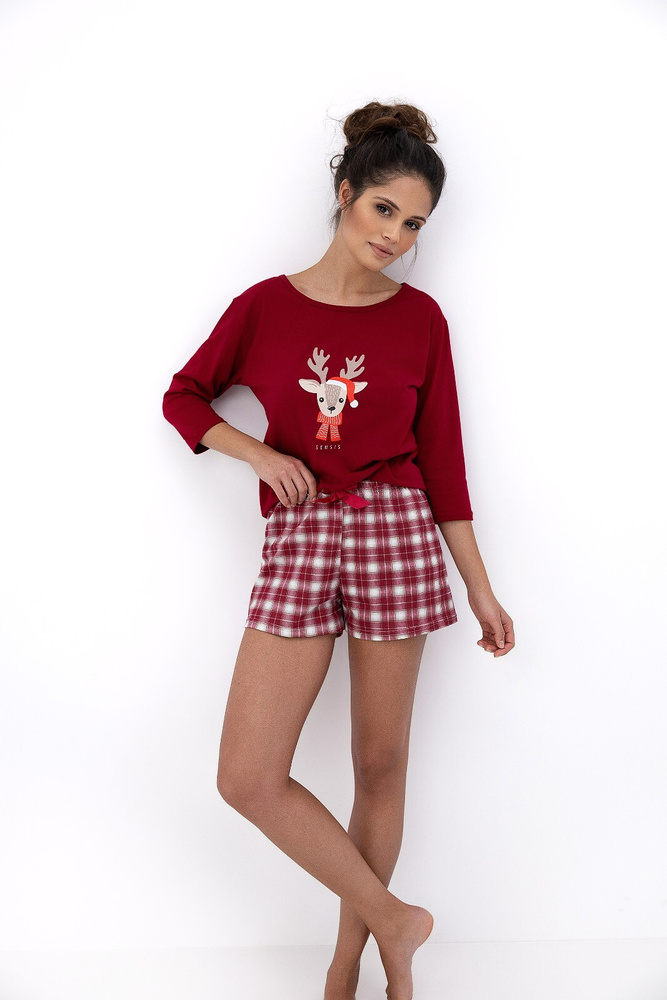 • Komfortowa piżama Elia Sensis wykonana w 100% z miękkiej, oddychającej bawełny. Zestaw składa się z koszulki z rękawem 3/4 z uroczym, świątecznym nadrukiem oraz szortów w kratkę z satynową kokardką.