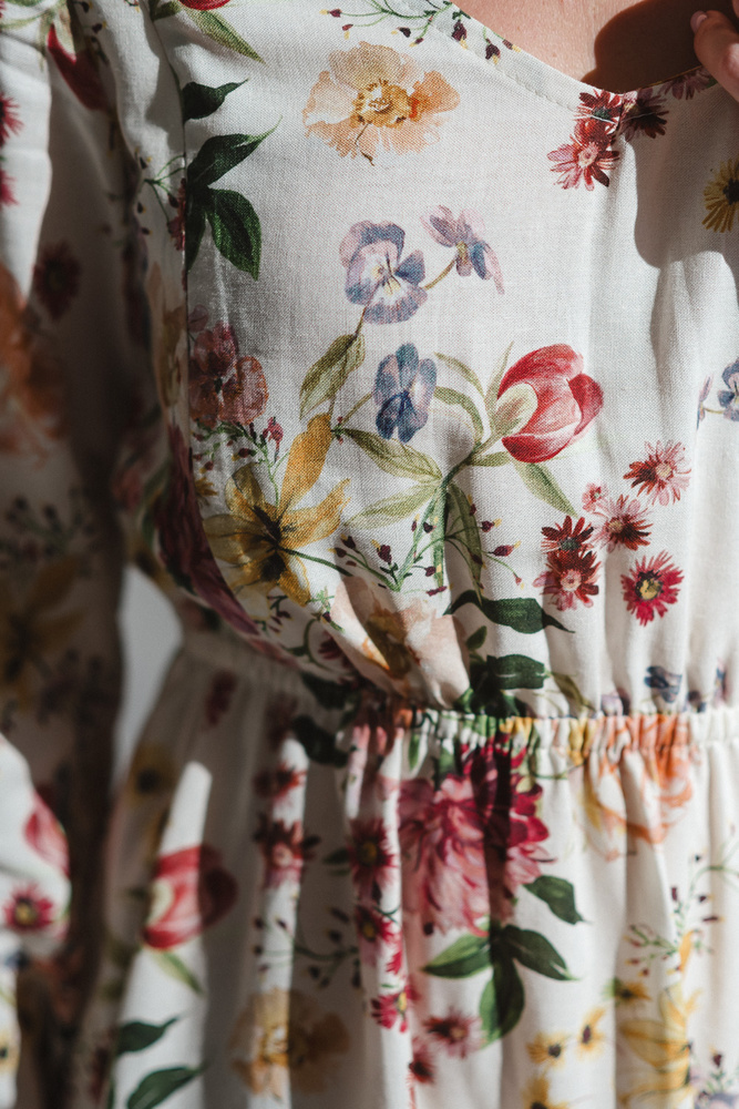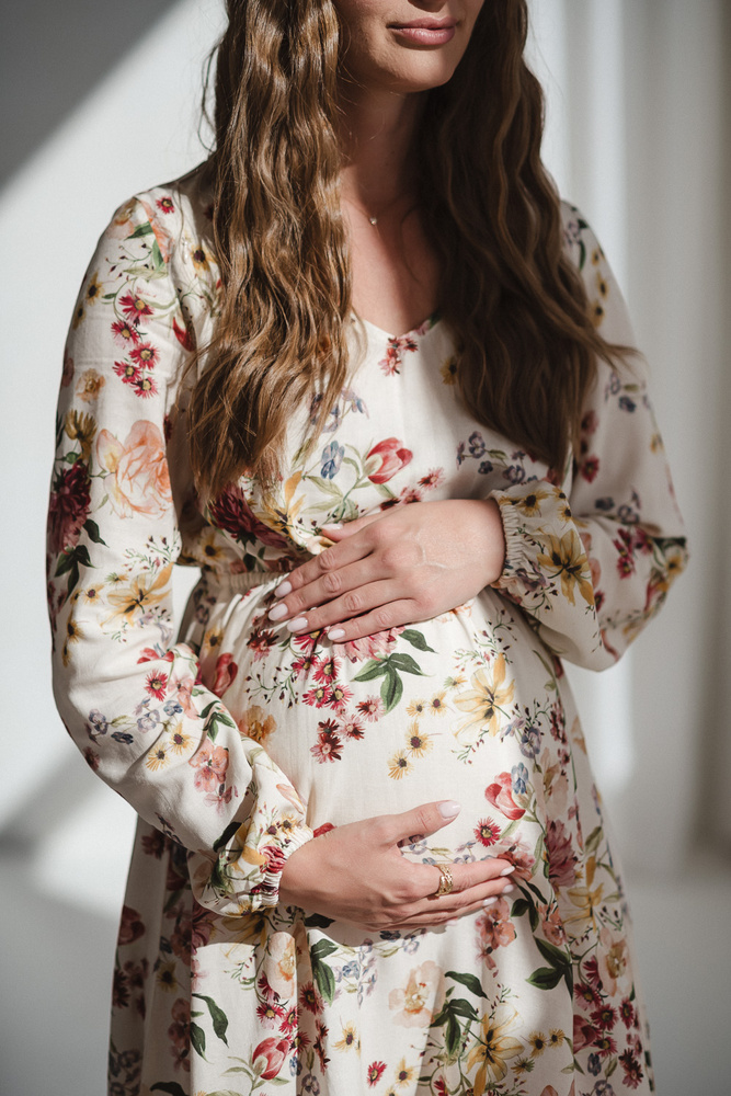 Il modello è dotato di una fascia elastica sotto il seno, che si adatta delicatamente alla pancia in crescita e, dopo la nascita, si adatta perfettamente alla silhouette. Le maniche lunghe a buffet, leggermente svasate, aggiungono un tocco chic, mentre la stampa di tendenza accentua il carattere leggero e moderno del capo.