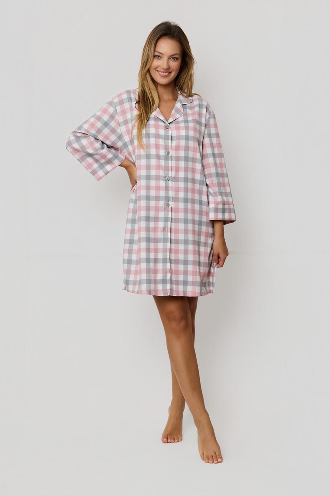 Camicia da donna Stella KG80 Mefemi by Nipplex rosa-grigio - elegante camicia a quadri in tessuto di alta qualità, maniche lunghe, bottoni, spacchi laterali