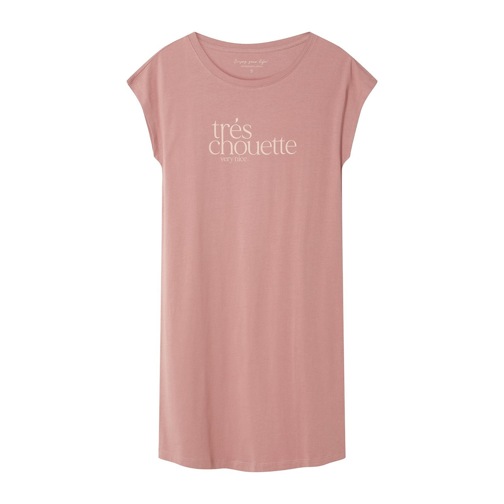 Le maniche corte e lo scollo semicircolare gli conferiscono un'eleganza discreta, perfetta per qualsiasi periodo dell'anno. Inoltre, sulla parte anteriore della camicia è presente una delicata iscrizione che ne accresce il carattere unico. La vestibilità rilassata rende la camicia da notte estremamente confortevole e non restrittiva, rendendola ideale sia per il sonno che per il relax quotidiano a casa. La sua lunghezza al ginocchio garantisce il comfort, senza preoccuparsi di materiali eccessivamente sostenuti.