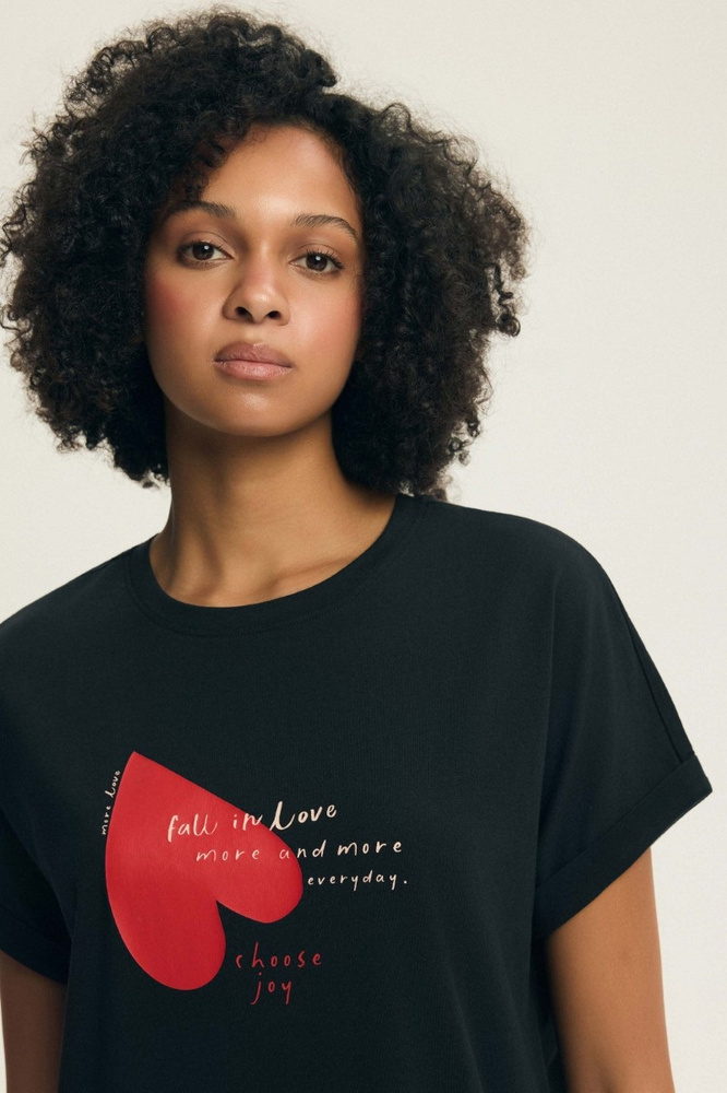 Le maniche corte e lo scollo semicircolare gli conferiscono un'eleganza discreta, perfetta per qualsiasi periodo dell'anno. Inoltre, sulla parte anteriore della camicia è presente una delicata iscrizione che ne accresce il carattere unico. La vestibilità rilassata rende la camicia da notte estremamente confortevole e non restrittiva, rendendola ideale sia per il sonno che per il relax quotidiano a casa. La sua lunghezza al ginocchio garantisce il comfort, senza preoccuparsi di materiali eccessivamente sostenuti.