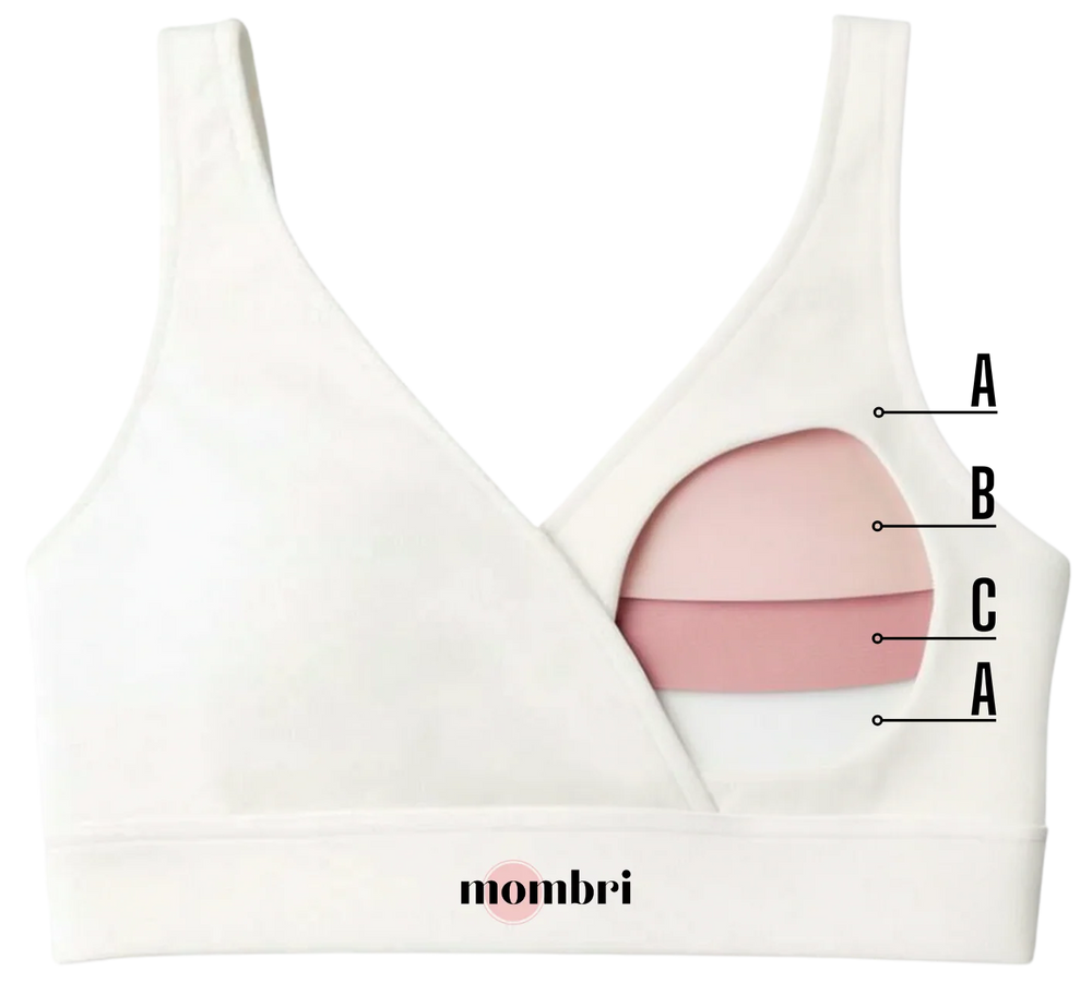 Il reggiseno è dotato di un inserto assorbente integrato con struttura multistrato e capacità di assorbimento di circa 25–40 ml. Il primo strato, a contatto con la pelle, assorbe rapidamente il latte. Il secondo trattiene il liquido sull’intera superficie della coppa. Il terzo strato impedisce la fuoriuscita verso l’esterno, mentre lo strato finale resta asciutto a contatto con gli indumenti. Il risultato è una sensazione di asciutto e protezione efficace anche durante le fasi di allattamento più intense.
