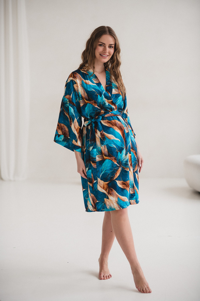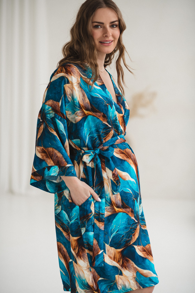 Il taglio kimono con cintura permette di regolare facilmente la larghezza, adattandosi al pancione in crescita e mantenendo comfort anche dopo la nascita. La lunghezza adeguata garantisce copertura e discrezione in ospedale o durante l’allattamento a casa. Le maniche 7/8 non intralciano nei movimenti quotidiani con il neonato, mentre le tasche pratiche sono utili per piccoli oggetti.