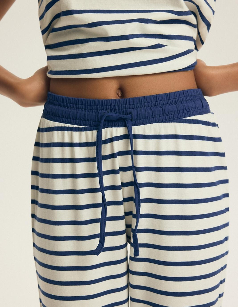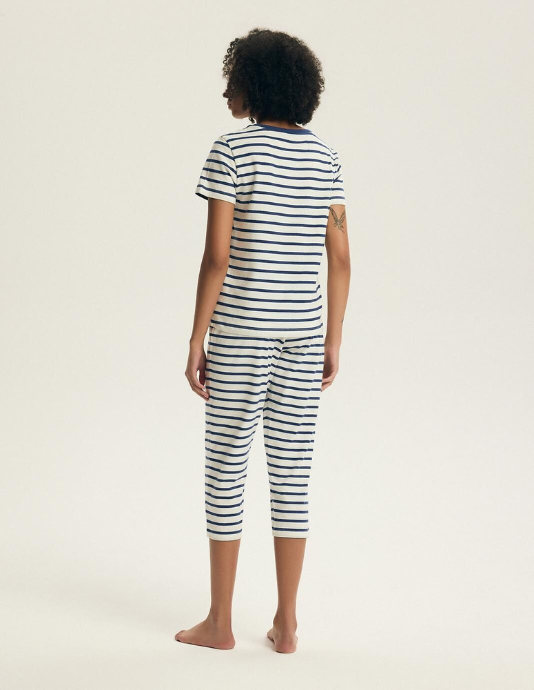 - Pigiama donna in 100% cotone con motivo a righe – maglia a manica corta e pantaloni 7/8 con laccio regolabile in vita. Comfort naturale per il sonno e il relax a casa.