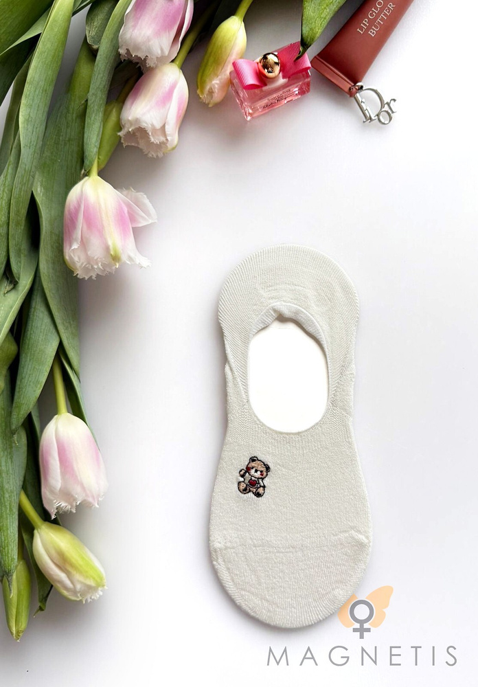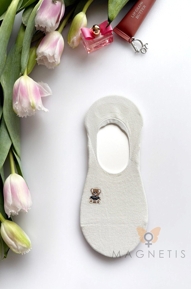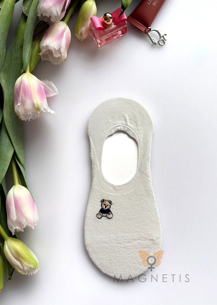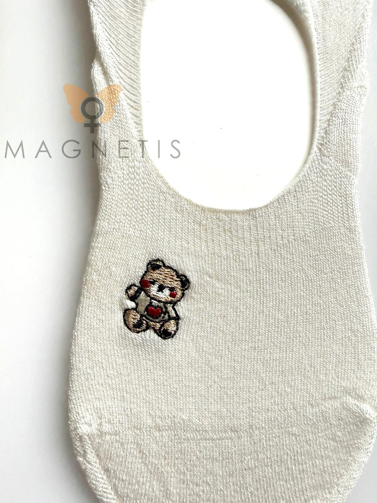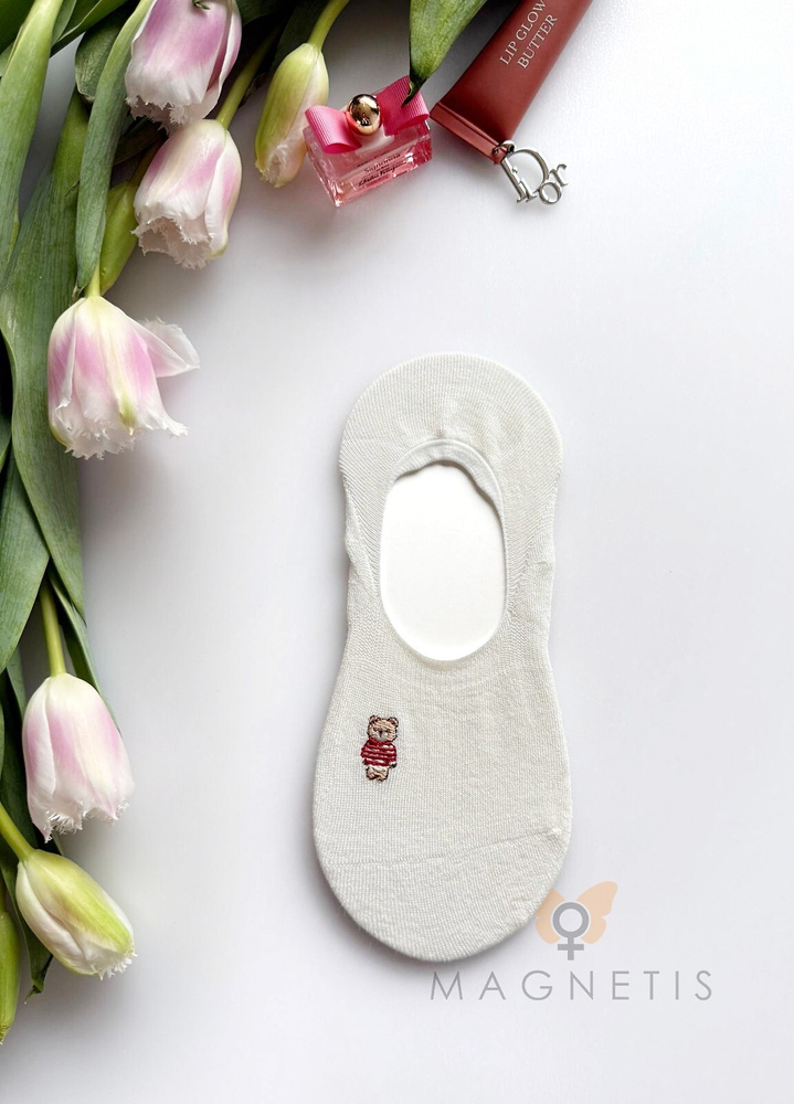 All’interno del tallone è presente una striscia in silicone che previene lo scivolamento durante la camminata. Questo dettaglio tecnico rende i fantasmini ideali per ballerine, mocassini e altre scarpe basse. Le applicazioni ricamate con motivo orsetto aggiungono un tocco discreto e femminile. I colori disponibili (bianco o nero) vengono selezionati casualmente in base alla disponibilità.