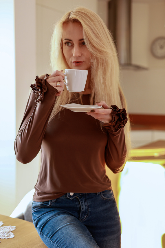 La blusa è completata da uno scollo rotondo classico, che conferisce al modello un carattere universale e senza tempo. Il fondo della blusa è rifinito in modo semplice e pulito, sottolineando il design elegante e minimalista.