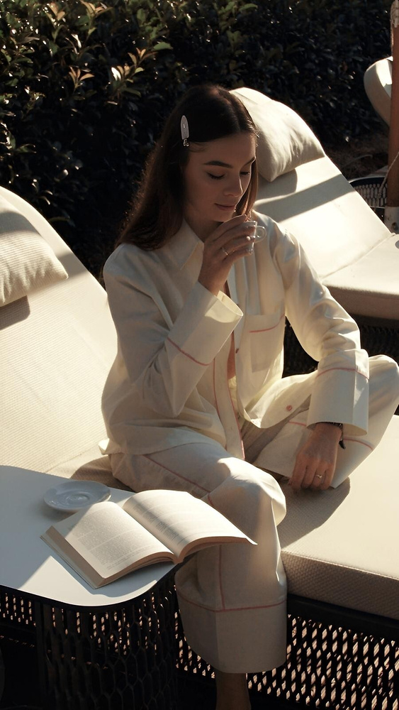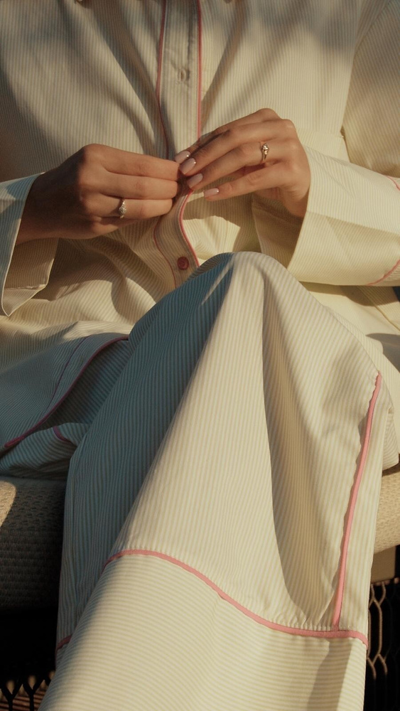 La parte superiore è composta da una camicia a maniche lunghe con motivo a righe. Il colletto classico e la chiusura frontale con bottoni conferiscono al capo un aspetto curato e leggermente elegante. Questo stile ricorda una camicia da casa, rendendo il completo adatto non solo per dormire, ma anche per trascorrere momenti di relax come la colazione del mattino o una serata tranquilla.