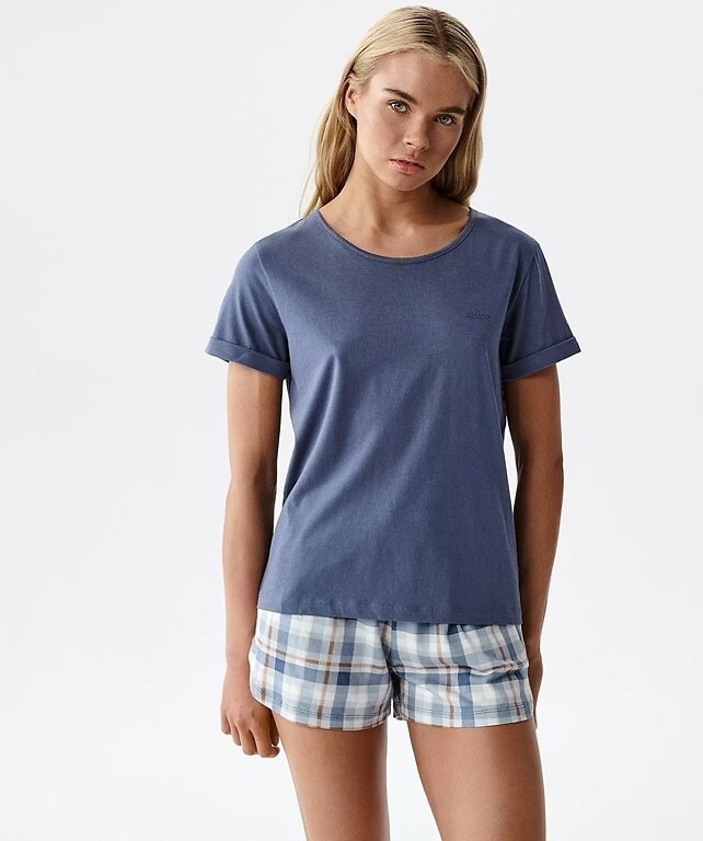 La parte superiore è una maglia con manica corta e scollo rotondo, pensata per adattarsi naturalmente alla silhouette senza stringere. Sul davanti è presente una scritta delicata che dona al pigiama un tocco moderno e casual. Il completo è abbinato a shorts fantasia con pratiche tasche all’altezza dei fianchi, che aggiungono funzionalità e comfort nell’uso quotidiano. La cintura elastica permette una vestibilità comoda e naturale.