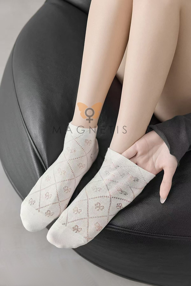- Comodi calzini invisibili da donna Magnetis CC-251102 in morbido cotone color ecru con piccoli motivi decorativi. Elastici, piacevoli al tatto e perfettamente aderenti al piede. Ideali per sneakers, ballerine o per l’uso quotidiano.