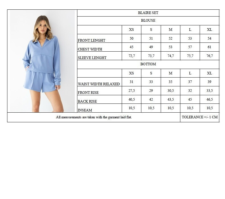 • Il completo Sensis Blaire in elegante tonalità denim blue unisce comfort sportivo e stile moderno. Felpa con colletto polo e shorts a vita alta creano un outfit perfetto per il relax a casa o per le giornate estive.