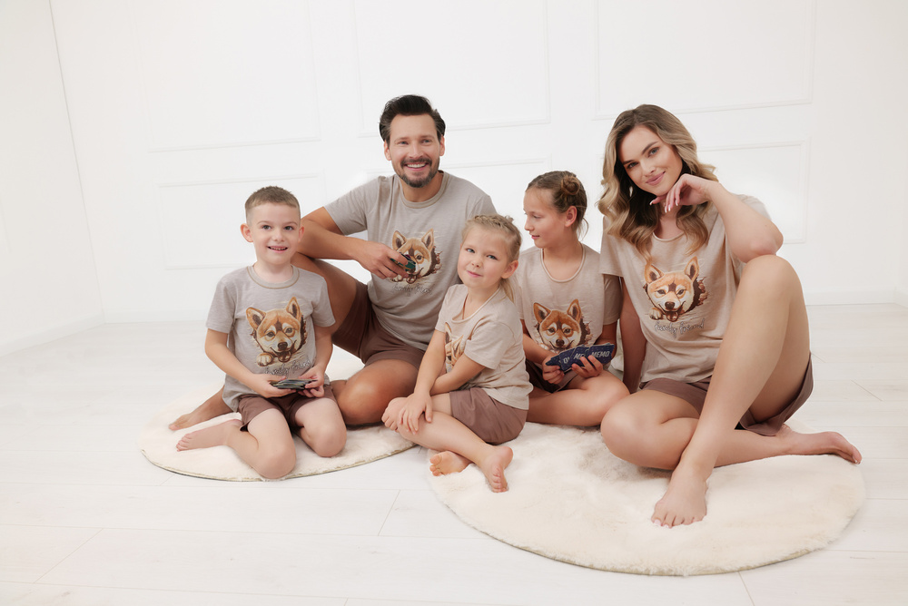La maglia presenta un taglio classico e dritto, con maniche corte e scollo rotondo. Non aderisce al corpo, permettendo libertà di movimento e comfort durante il sonno e il relax. La stampa con il cagnolino shiba e la scritta „family friend” dona al completo un carattere simpatico e rilassato.
