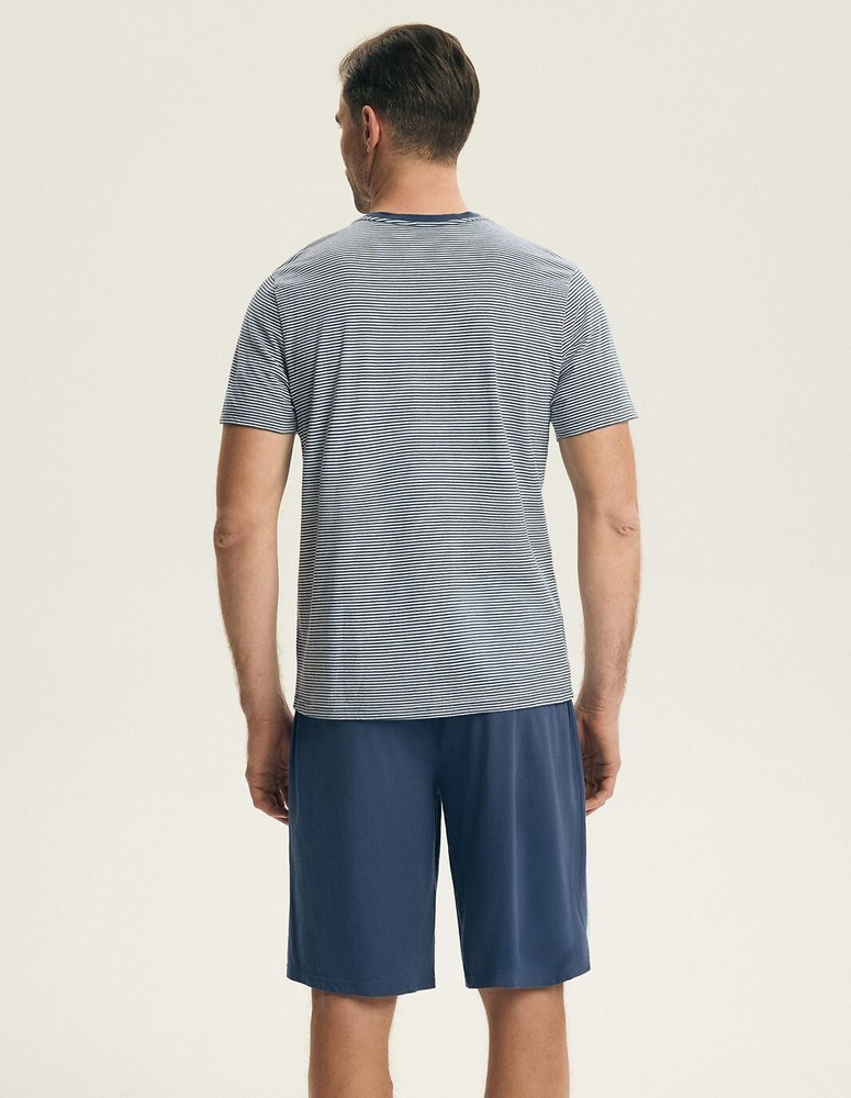 La maglietta a manica corta è realizzata in 100% cotone, un tessuto morbido e traspirante che favorisce la ventilazione della pelle e aiuta a mantenere una temperatura corporea piacevole durante la notte. La struttura del tessuto rende il capo adatto anche alle stagioni più calde, evitando la sensazione di calore eccessivo. Il taglio essenziale permette di utilizzare il completo non solo come pigiama, ma anche come abbigliamento comodo per la casa.