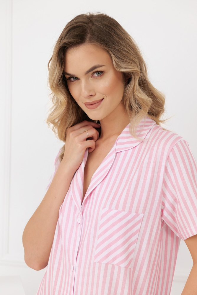 Il motivo a righe verticali dona leggerezza visiva e slancia la figura, mentre il colletto classico in stile camicia aggiunge un tocco elegante e senza tempo. Grazie a questo design, il modello può essere indossato non solo per dormire, ma anche come comodo abbigliamento da casa.