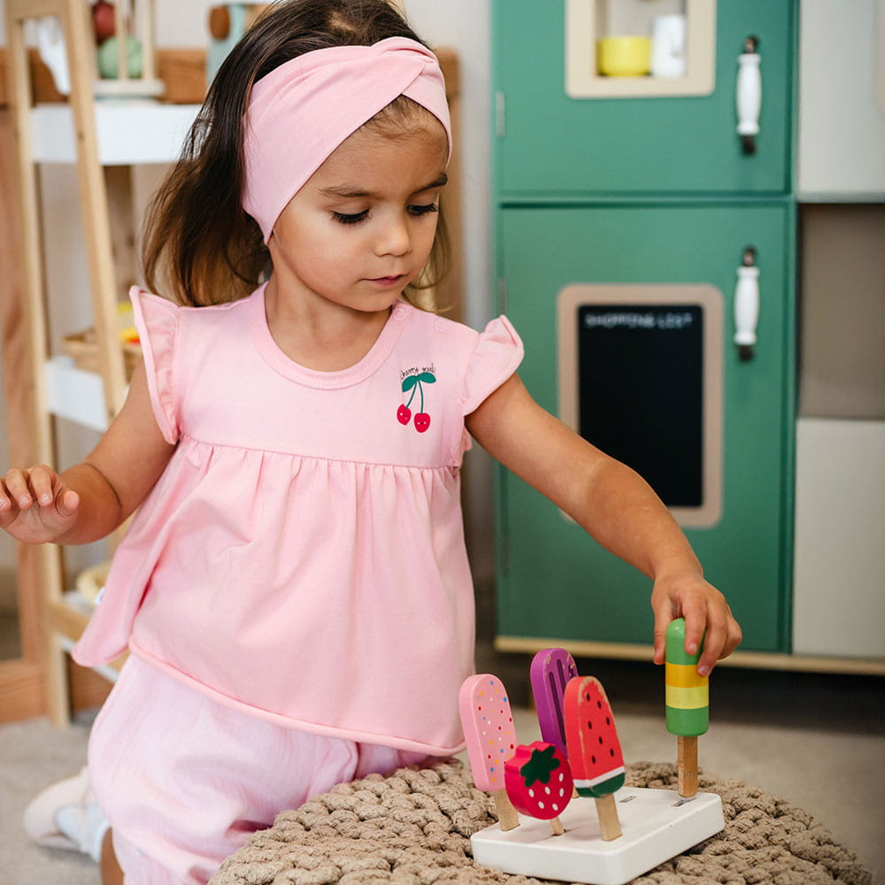 Se cerchi un capo comodo ma anche curato per la tua bambina nelle giornate più calde, la body tunica Eevi Cherry in colore rosa chiaro con stampa di ciliegie è una scelta pratica e piacevole. Questo modello unisce la funzionalità del body alla leggerezza di una tunica, risultando ideale per l’uso quotidiano, le passeggiate e il gioco all’aperto.
