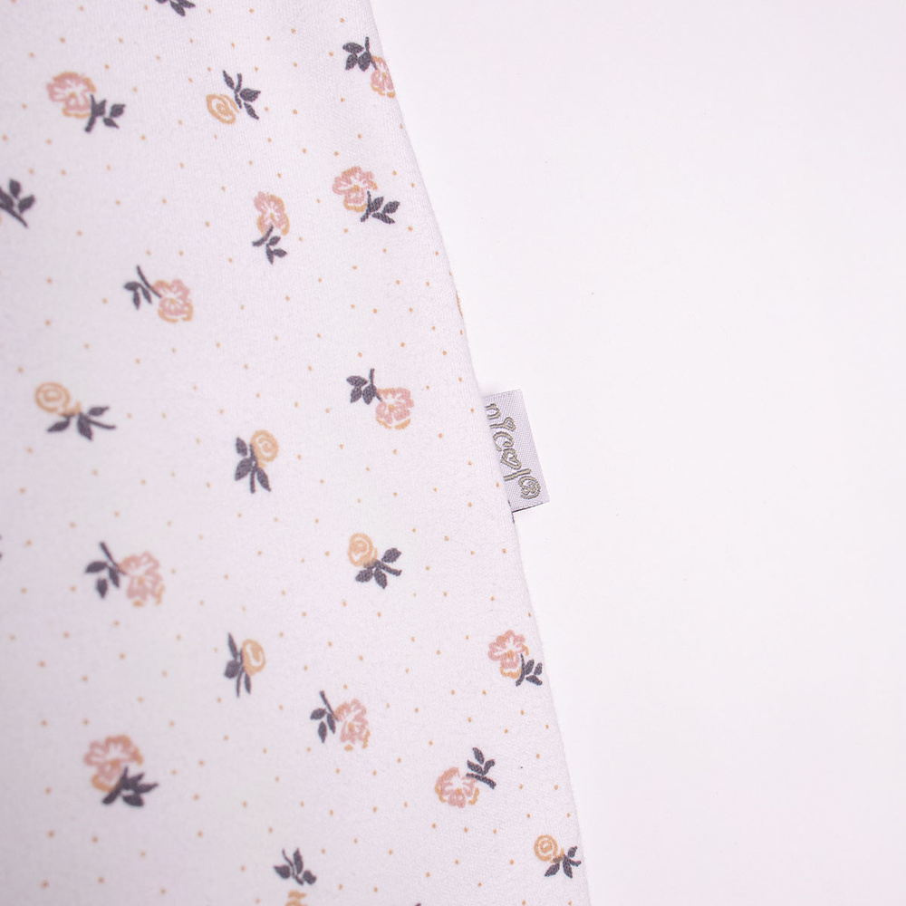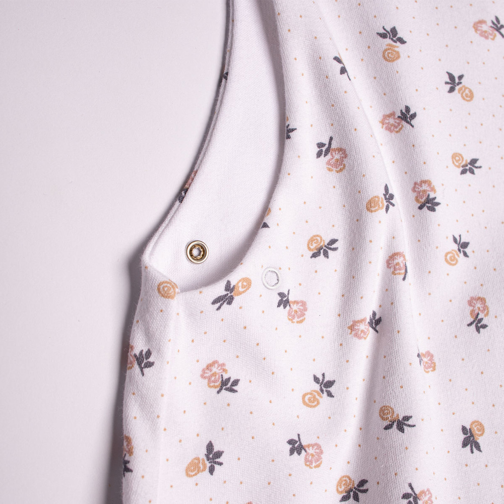 La pratica zip frontale facilita il cambio e la vestizione quotidiana, mentre i bottoni automatici senza nichel sotto le ascelle permettono di regolare la vestibilità. La stampa floreale delicata in tonalità neutre dona un aspetto elegante e si abbina facilmente al guardaroba del bambino.