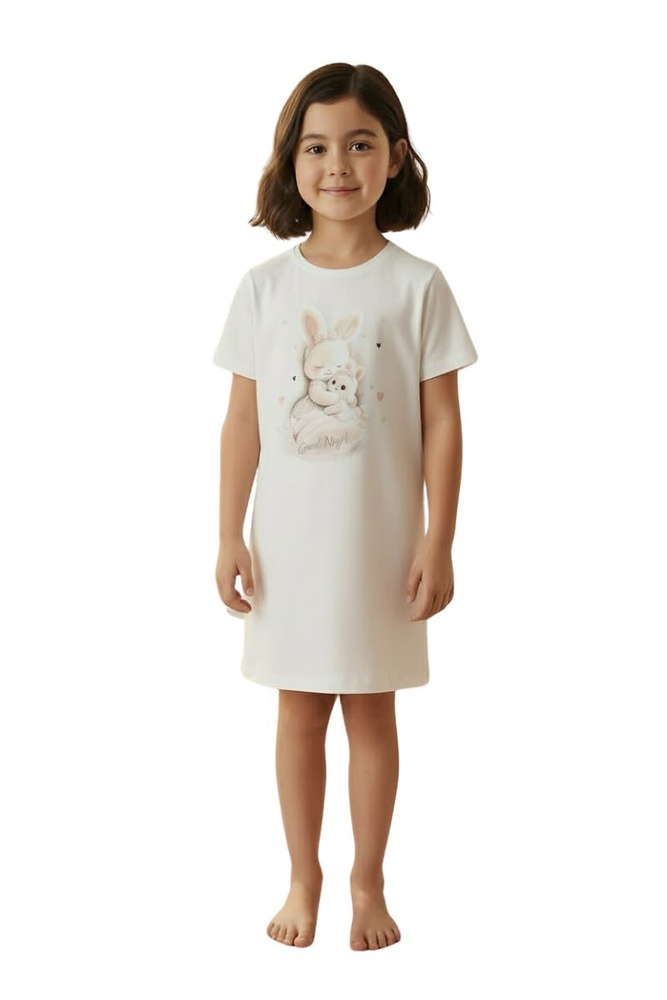 Il tessuto 100% cotone è piacevole al tatto e adatto anche alle pelli più sensibili. La manica corta e la vestibilità leggermente ampia assicurano libertà di movimento, importante sia durante il sonno che nei momenti di relax a casa. Il colore ecru, abbinato alla stampa colorata con coniglietti, crea un look dolce e adatto alle bambine.