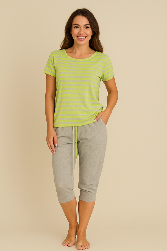 Pigiama da donna in viscosa di alta qualità. T-shirt a righe con maniche corte, schiena leggermente allargata. Pantaloni solidi con tasche a 3/4. Gambe con estremità nervate.