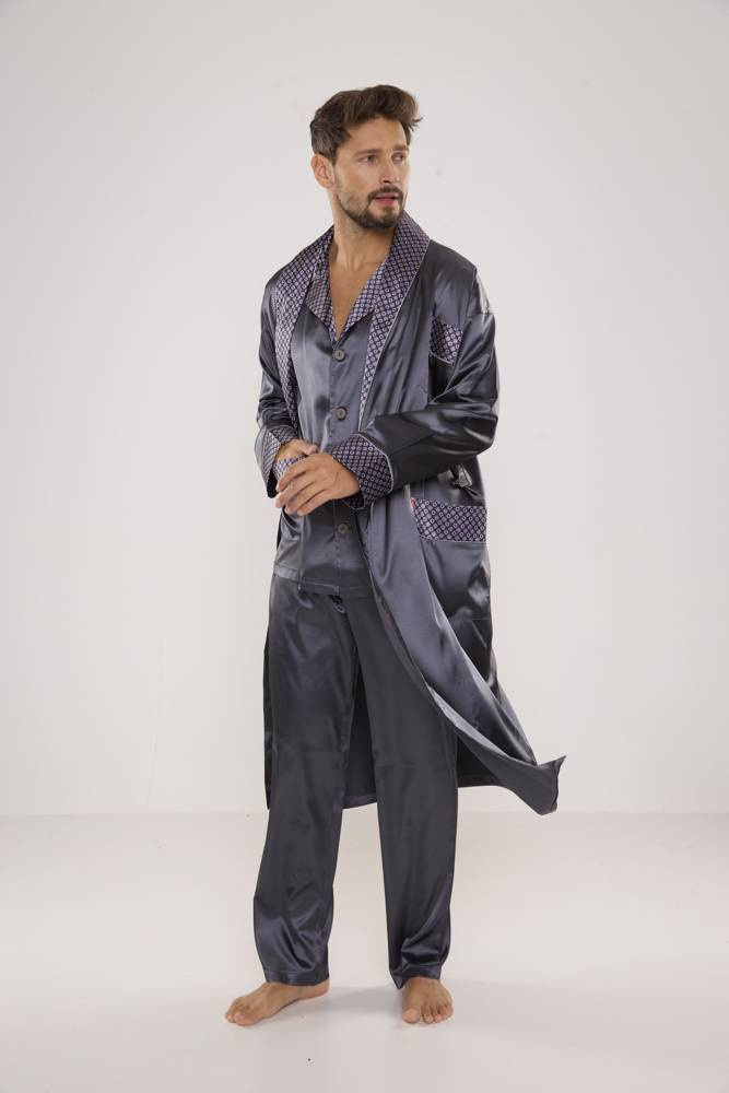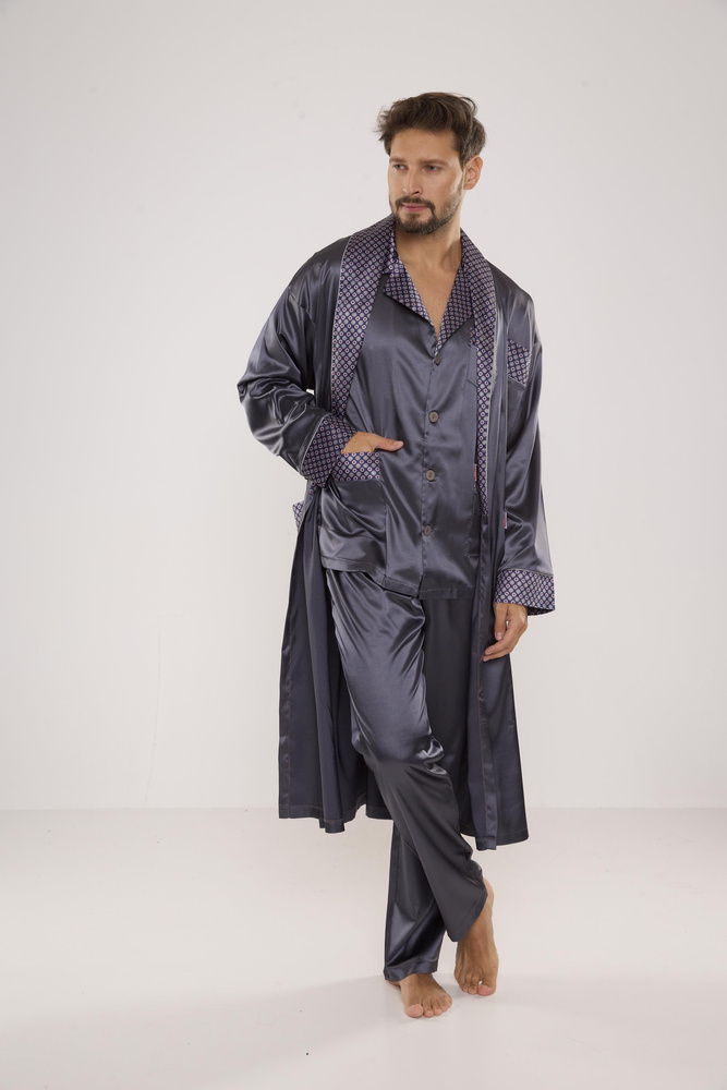 Pigiama da uomo elegante, lungo, sbottonato con colletto e tasche.