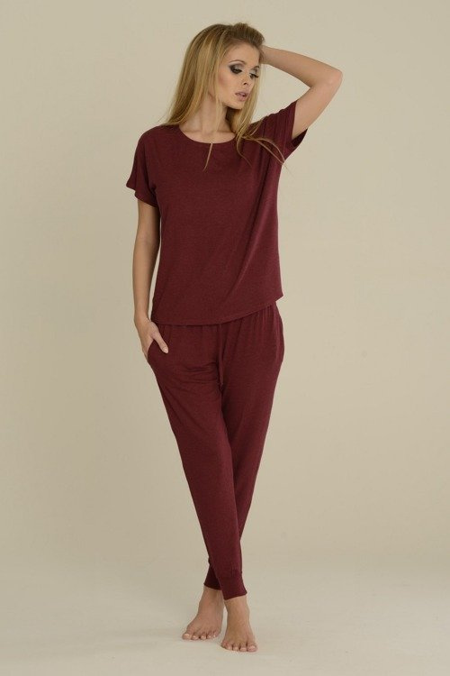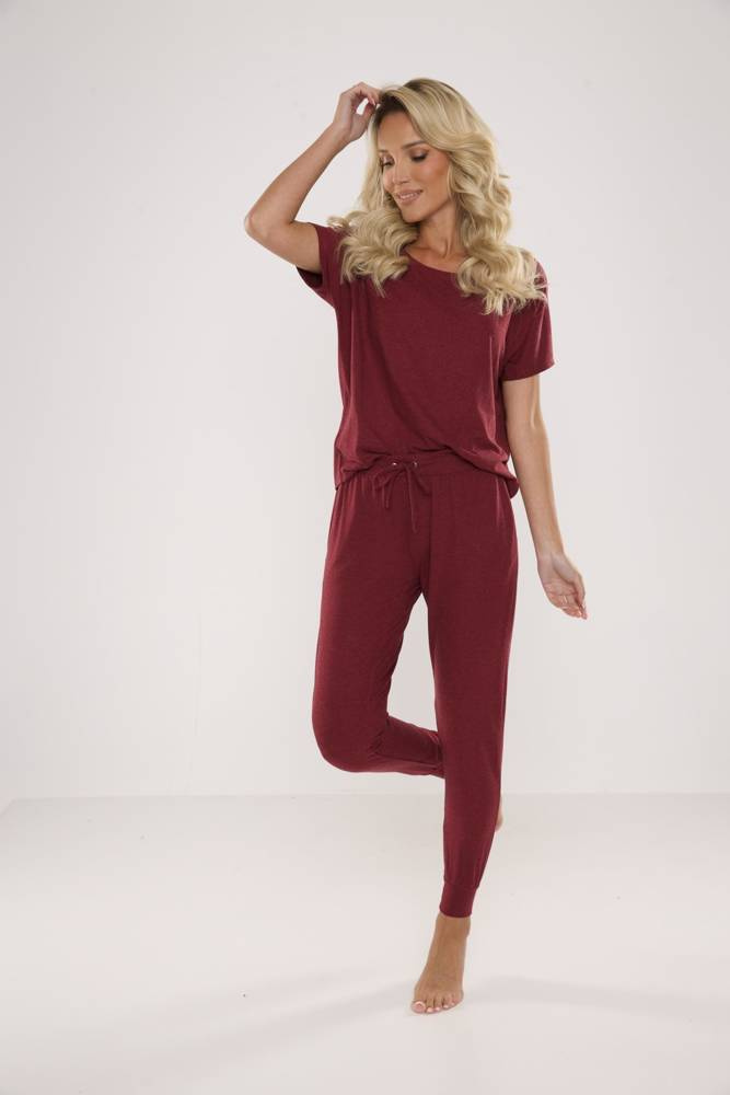 Pigiama da donna in viscosa di alta qualità con elastan. T-shirt aderente con maniche corte in reglan. Pantaloni lunghi con tasche, estremità delle gambe a filetto.