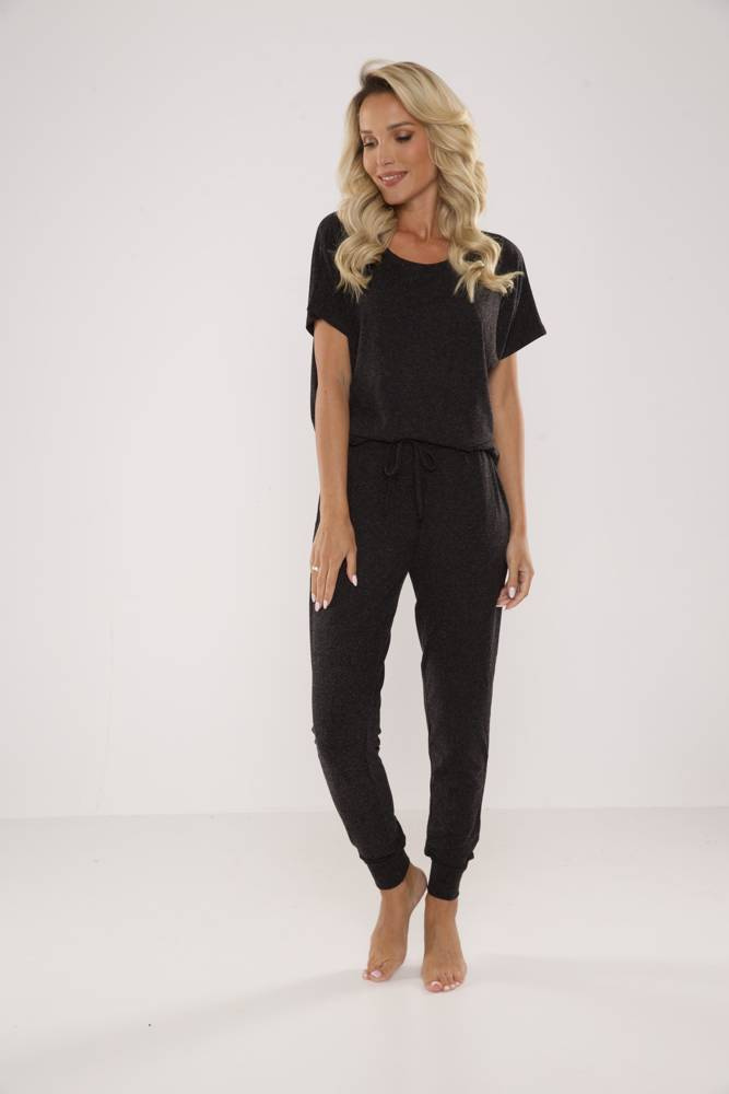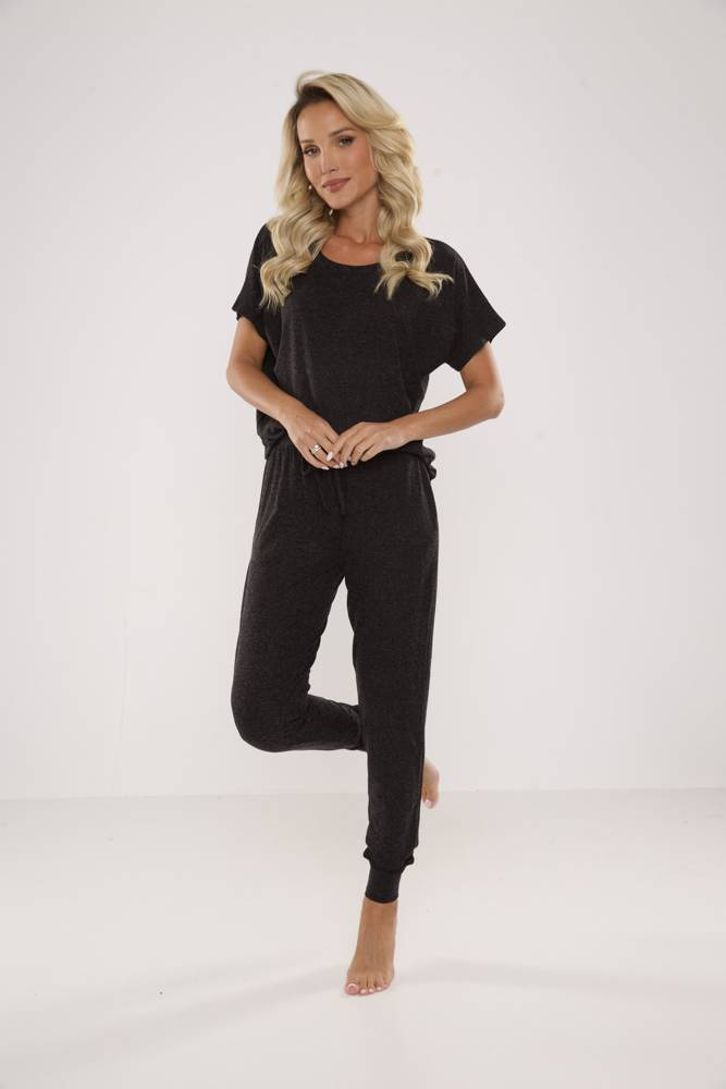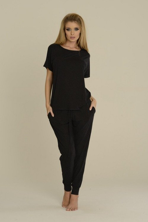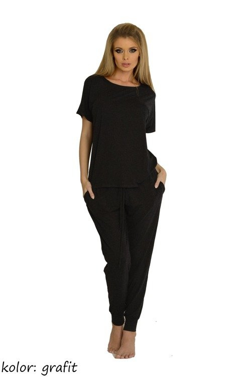 Pigiama da donna in viscosa di alta qualità con elastan. T-shirt aderente con maniche corte in reglan. Pantaloni lunghi con tasche, estremità delle gambe a filetto.