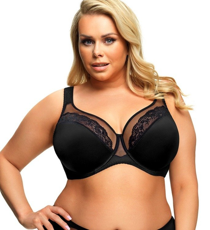Reggiseno morbido con ferretto - linea superiore in tulle e pizzo delicato con motivi floreali. Fianchi in tessuto di lycra elastica ed elasticizzata, rinforzati con osso di balena verticale, spalline non staccabili, foderate in cotone - la loro larghezza dipende dalla taglia.