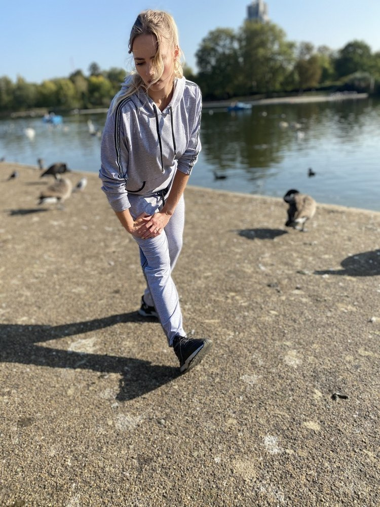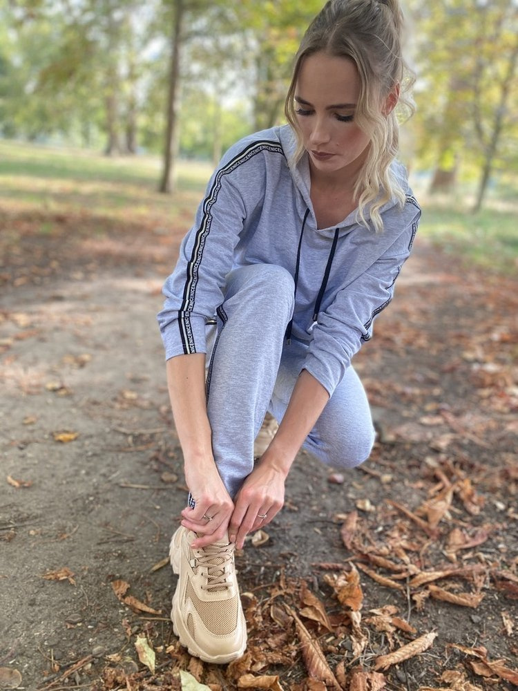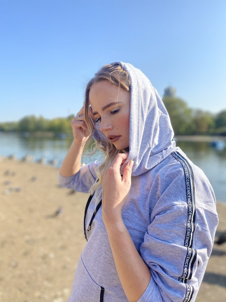 Confortevole tuta da ginnastica da donna in materiale adatto al corpo. Felpa con cappuccio a maniche lunghe. A livello addominale, la tasca. Pantaloni con tasche. Cintura con coulisse. Maniche e gambe rifinite con scritte.