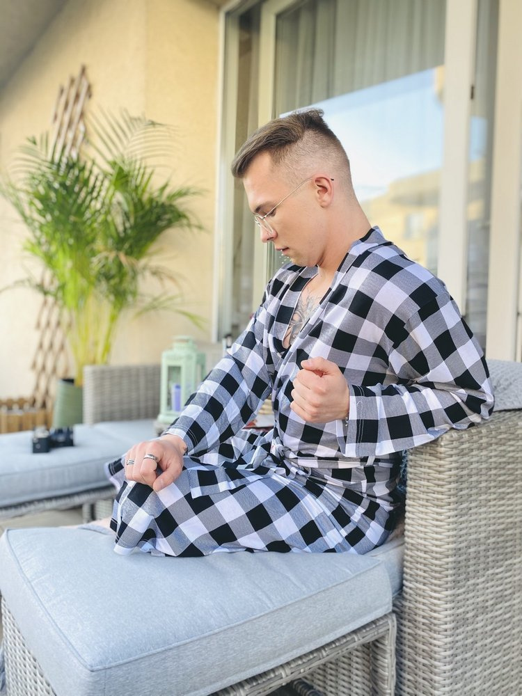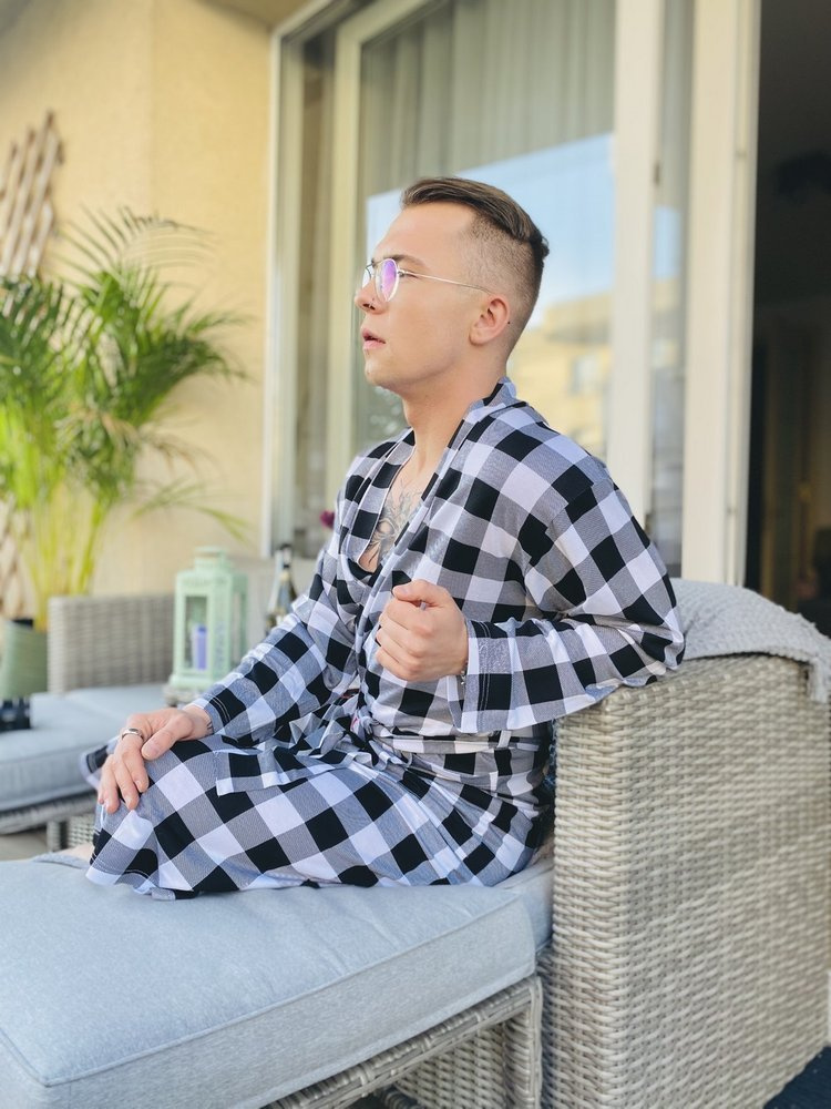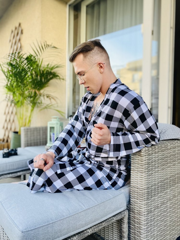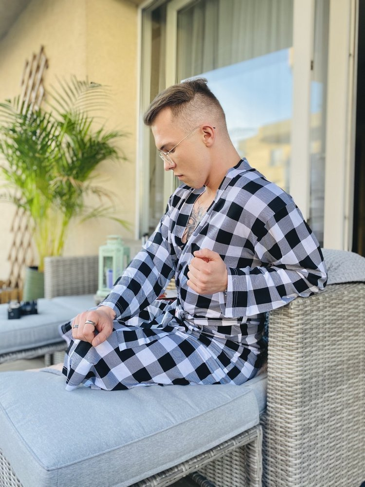 Accappatoio sottile e piacevole al tatto, realizzato in morbida viscosa. L'accappatoio è legato in vita, ha due tasche laterali e un colletto. Tutti ina scacchi, che gli conferisce un fascino particolare. Modello resistente asfregamentoe fornisce un'eccellente protezione dal freddo.