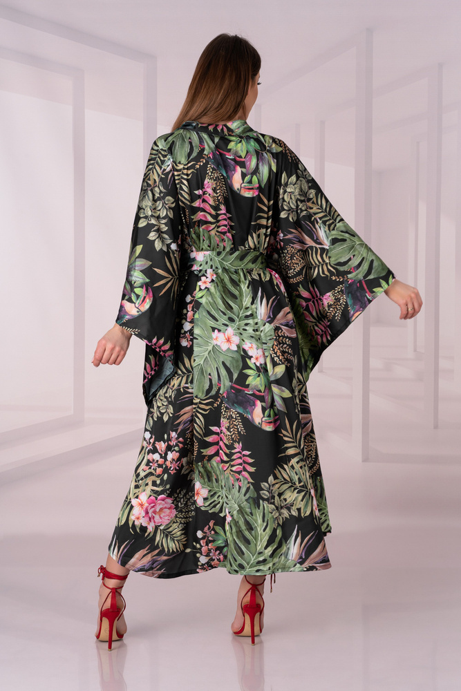 Combinando una sottile sensualità con un'elegante originalità. Legata in vita con una spessa fusciacca, la vestaglia è realizzata in tessuto arioso. Materiale morbido e piacevole al tatto. Il tessuto nero è decorato con un'originale fantasia a motivi floreali. I bordi del tessuto sono stati protetti dal pilling piegando e foderando la stoffa, per ottenere una finitura elegante. Il taglio a busta della vestaglia consente di regolare facilmente la profondità della scollatura. Le maniche comode e ampie non limitano i movimenti per garantire comfort e libertà d'uso. La vestaglia è perfetta per ogni tipo di corpo. È stato progettato per coprire le imperfezioni ed esporre i punti di forza della figura.