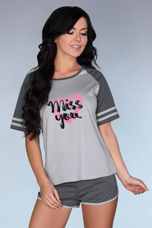 Pigiama in cotone molto comodo, composto da pantaloncini corti grigio scuro bordati in basso da un bordino più chiaro e da una camicia scura a maniche corte color cenere con bordino. Inoltre, la T-shirt presenta scritte nere su un cuore rosa.