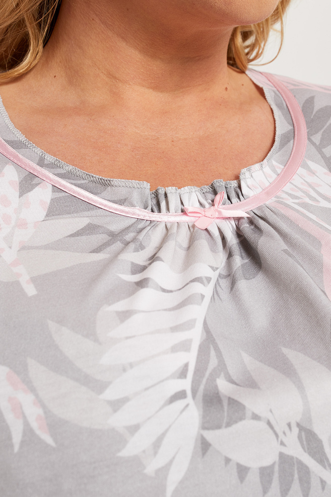 I bellissimi e delicati pigiami da donna Bartonia sono disegnati in morbidi colori pastello. La blusa è realizzata in tessuto rivestito con una tenue e morbida fantasia di foglie grigio-rosa su sfondo grigio. La scollatura rotonda è ornata da un nastro rosa e decorata da un fiocco dello stesso colore. I pantaloni del pigiama hanno un taglio dritto con un'altezza elevata e un comodo elastico in vita senza pressione.