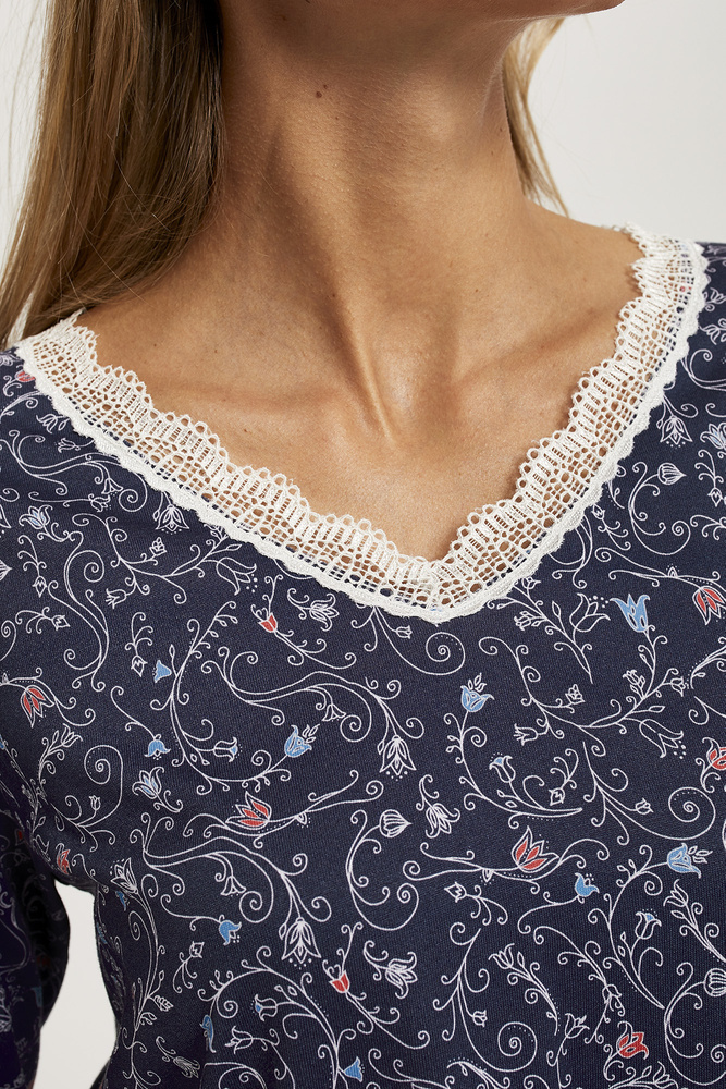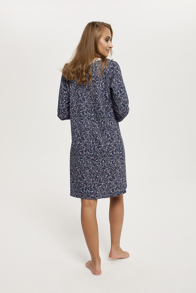 Camicia donna a maniche lunghe in fantasia. Il bellissimo motivo su sfondo scuro attira l'attenzione e aggiunge fascino alla camicia. La scollatura è rifinita con pizzo a contrasto. La lunghezza complessiva della camicia arriva prima del ginocchio. Il cotone pregiato di alta qualità utilizzato per cucire la camicia è sicuro e delicato sulla pelle. La lunga durata è garantita dalla qualità del tessuto utilizzato e dalla precisione delle cuciture.