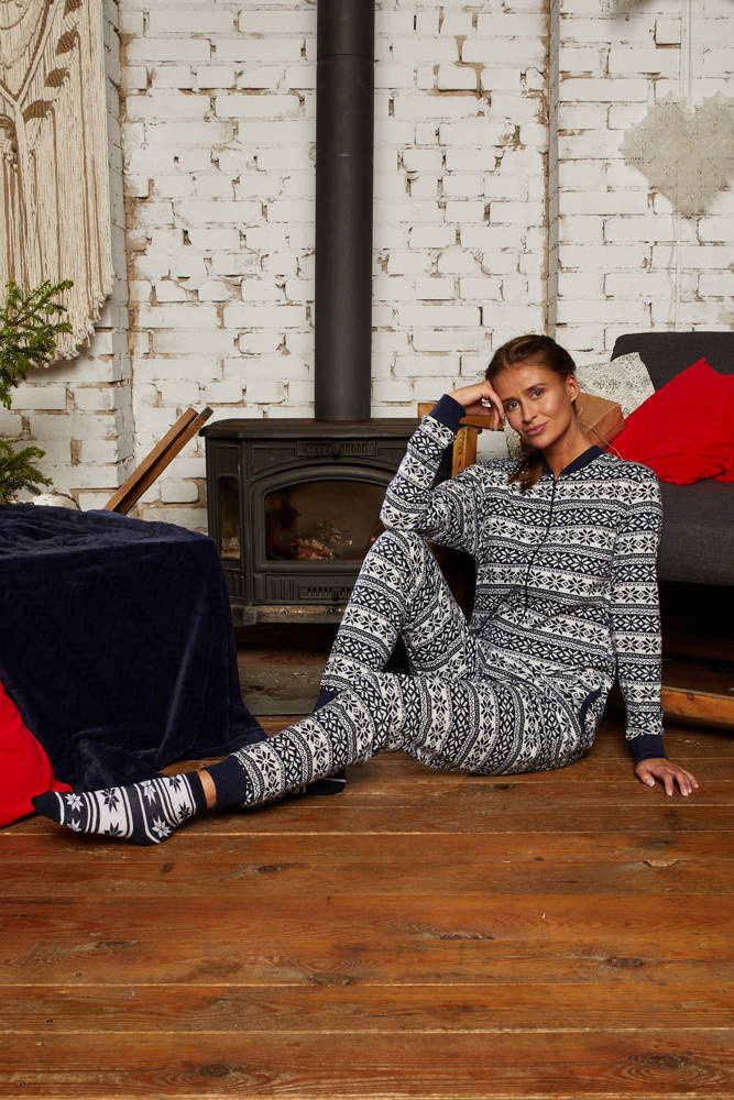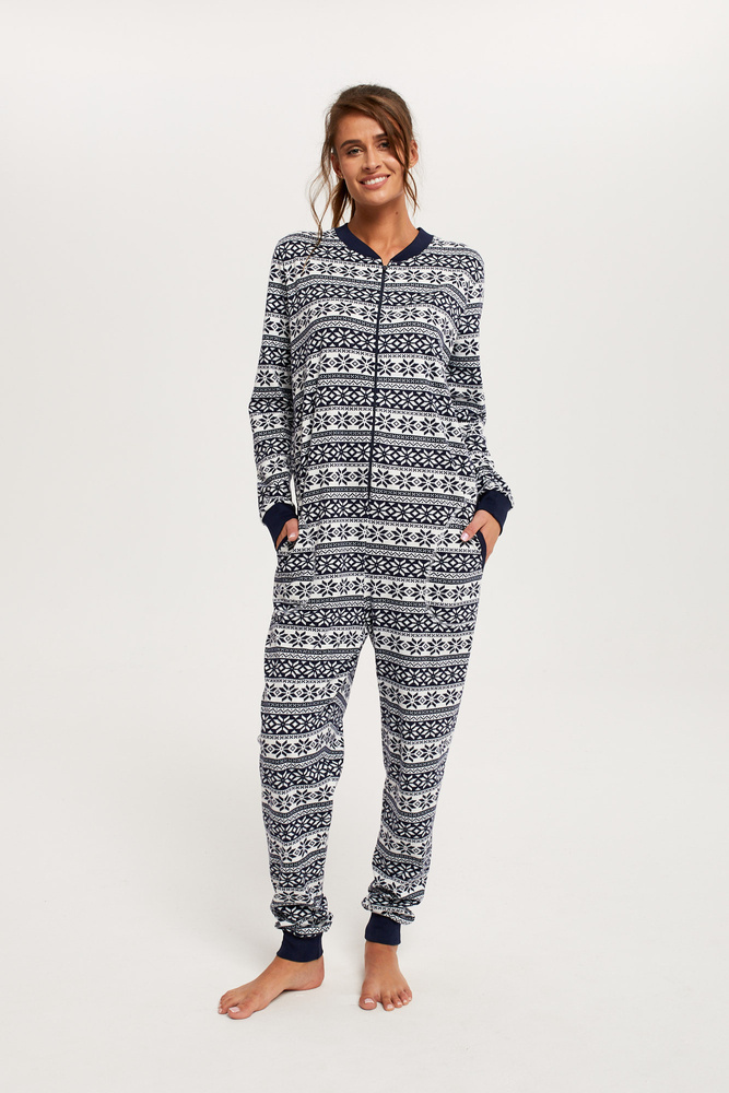 Un'insolita tuta da donna con un'affascinante stampa animalier è una proposta interessante per la prossima stagione. L'intero tessuto è stato cucito in jersey di cotone al 100%. Realizzati in due versioni di colore: rosso scuro e blu navy, sono cosparsi di fiocchi di neve bianchi. La tuta si chiude con una cerniera che la rende comoda da usare e il prodotto stesso è molto comodo e funzionale.