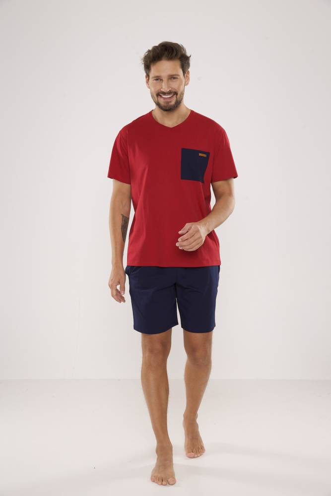 Pigiama da uomo in morbida viscosa di alta qualità. Modello con taglio classico. T-shirt a maniche corte, scollo a mezza luna. Pantaloni corti, solidi, rifiniti con un comodo elastico in vita. Si rivolge ai più esigenti un uomo.