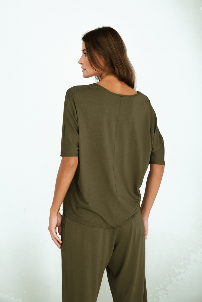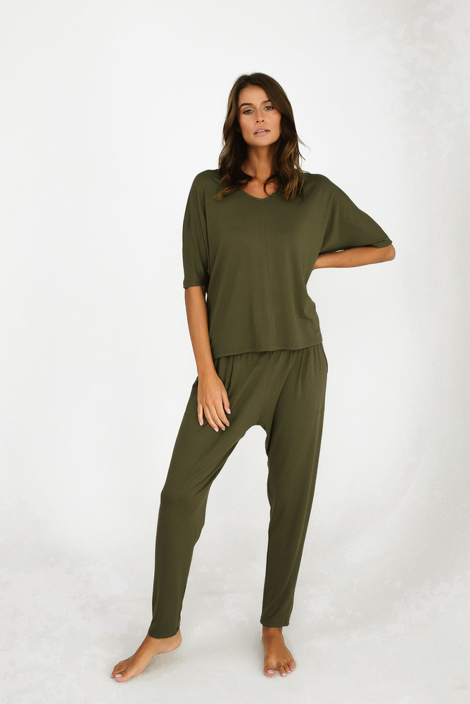 La collezione PARAMO in viscosa è perfetta per tutte le stagioni. La sua versatilità è dovuta al colore kaki tenue e al materiale altamente adattabile alle diverse temperature. La viscosa protegge la pelle dal freddo, ma la struttura di questo tessuto è traspirante e regola efficacemente la temperatura corporea. Inoltre, la viscosa morbida e molto piacevole al tatto offre un comfort straordinario durante il sonno, che si ottiene anche grazie all'elastico non pressurizzato dei pantaloni e al taglio ampio. Il fascino del set è aggiunto dal taglio originale e un po' pignolo. È la scelta ideale per chi privilegia il comfort e la classe.