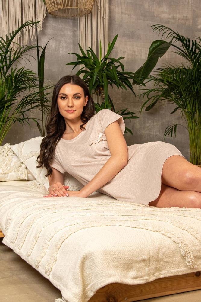 Camicia da donna in cotone di alta qualità e piacevole al tatto. Maglietta a maniche corte. Scollo semicircolare. Dlunghezza prima del ginocchio. Taglio molto confortevole, delicatamente adattato al corpo. Si rivolge alle donne che amano la morbidezza e la libertà.