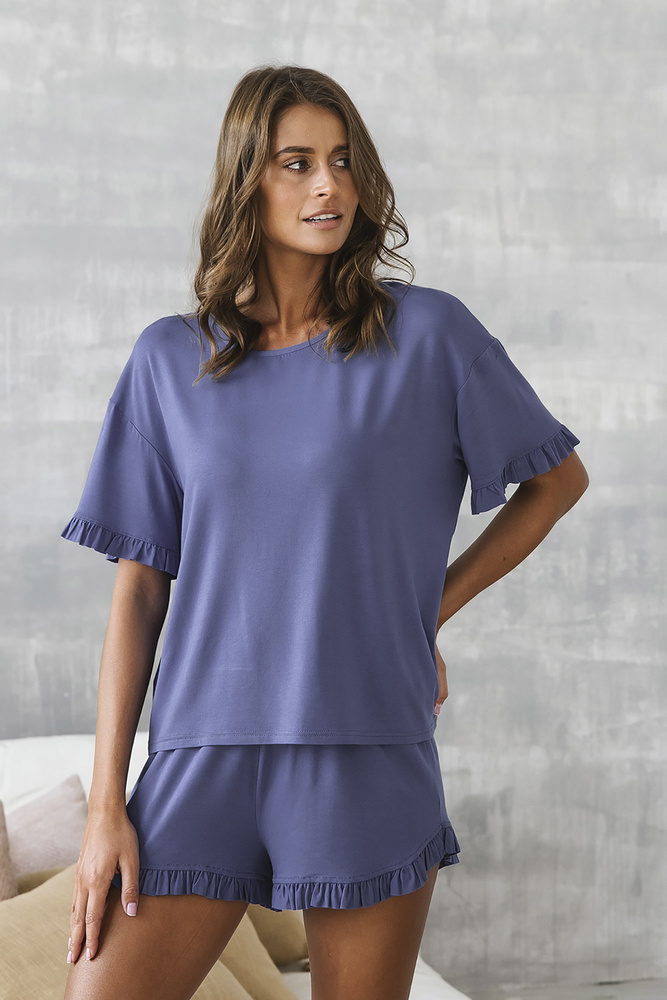 Pyjama Style è la scelta perfetta per chi cerca un pigiama originale e allo stesso tempo elegante. La viscosa, leggermente drappeggiante e piacevole al tatto, regola molto bene la temperatura corporea. Si adatta perfettamente a tutti i tipi di figure. I delicati volant sulle maniche e sulle gambe aggiungono un tocco di charme e rendono questo taglio di pigiama di sicuro effetto.